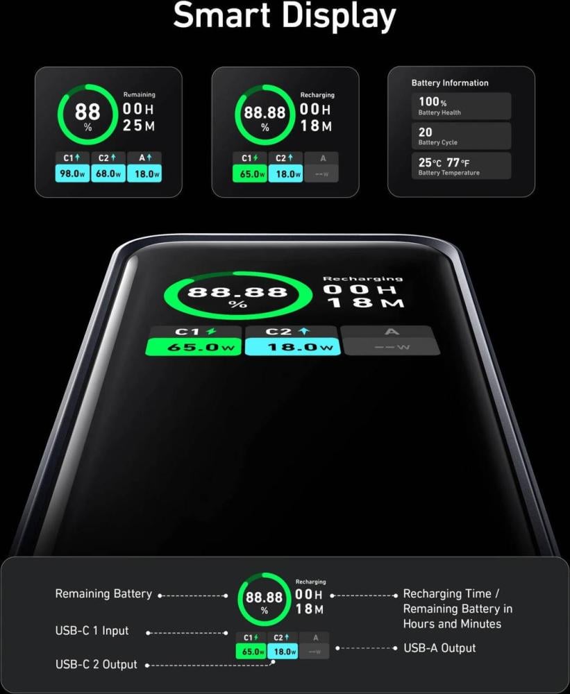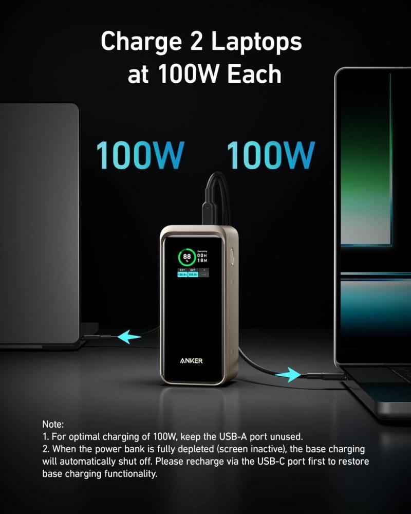 • يدعم إعادة الشحن بقدرة 100 واط عبر منفذ USB-C، مما يتيح شحن بنك الطاقة بالكامل في ساعة و15 دقيقة فقط